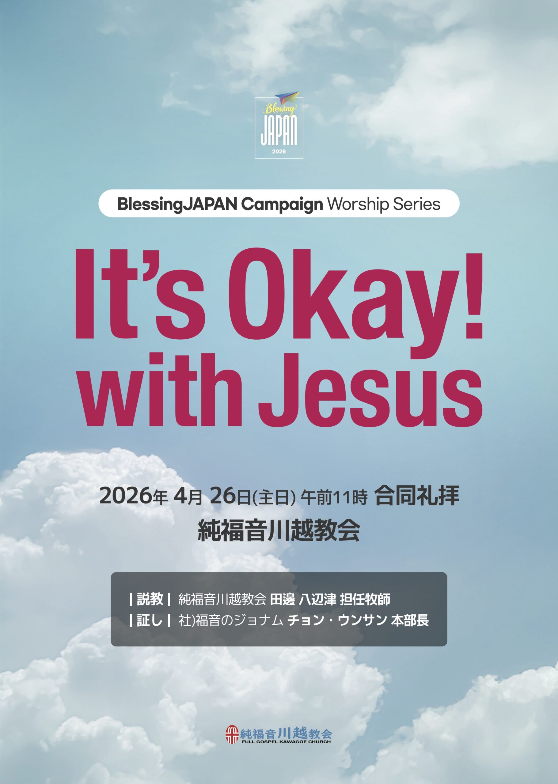 ハレルヤ! 広告伝道団体 「福音の伝達」と共に礼拝が捧げられます。 新しい視点と共に、日本一千万救霊のために祈り、立ち上がりましょう! 日時: 2026年04月...